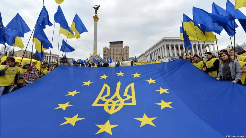 Cờ Liên Âu hòa cùng biểu tượng chiếc đinh ba của Ukraine (vàng và xanh nước biển cũng là màu cờ Liên Âu và quốc kỳ hai mầu Ukraine). © AFP