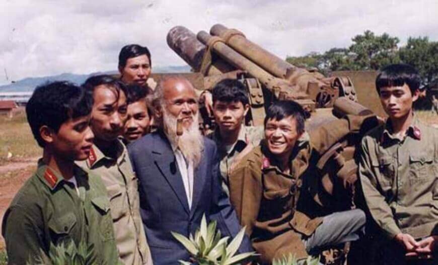 Núp, một cán bộ cộng sản gốc Thượng nằm vùng, chụp ảnh với binh sĩ Sư đoàn 320, tháng 12/1990