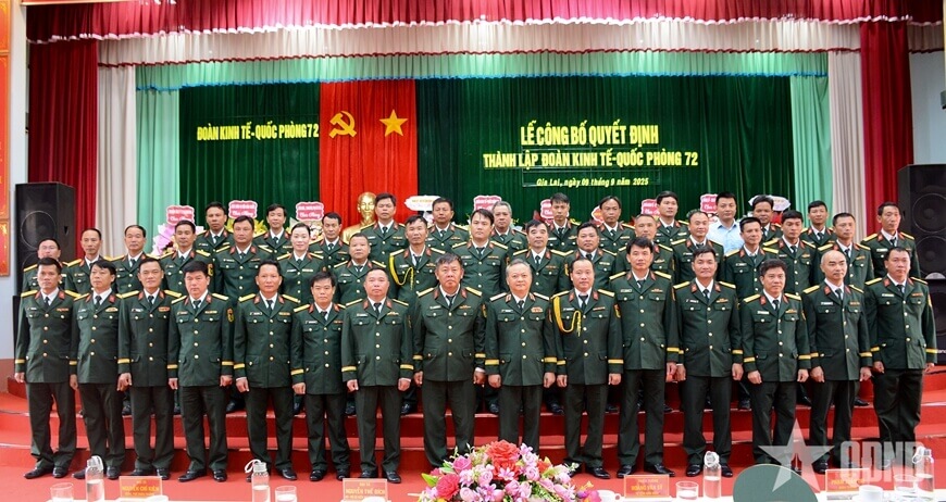 Thiếu tướng Hoàng Văn Sỹ và lãnh đạo các cơ quan Binh đoàn 15 chụp ảnh lưu niệm với Đoàn kinh tế - Quốc phòng 72 (09/09/2025.