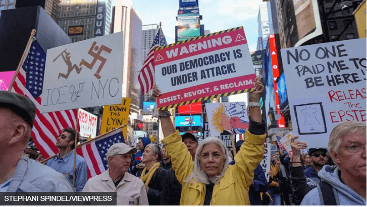Hàng ngàn người đã tập trung tại Quảng trường Thời đại biểu tượng của Thành phố New York và các con phố xung quanh, với những người cầm biểu ngữ có khẩu hiệu như "Dân chủ chứ không phải Quân chủ" và "Hiến pháp không phải là điều tùy chọn".