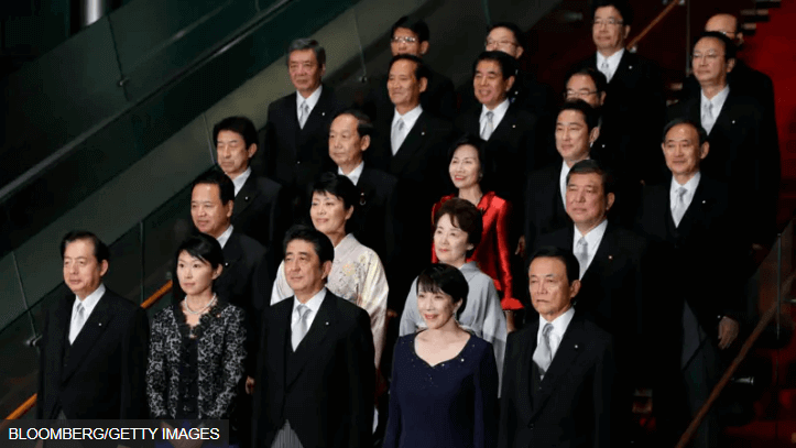 Sanae Takaichi (hàng đầu tiên, thứ 2 từ phải sang) được cố thủ tướng Nhật Bản Shinzo Abe bổ nhiệm làm Bộ trưởng Nội vụ và Truyền thông vào năm 2014 - Bloomberg/Getty Images