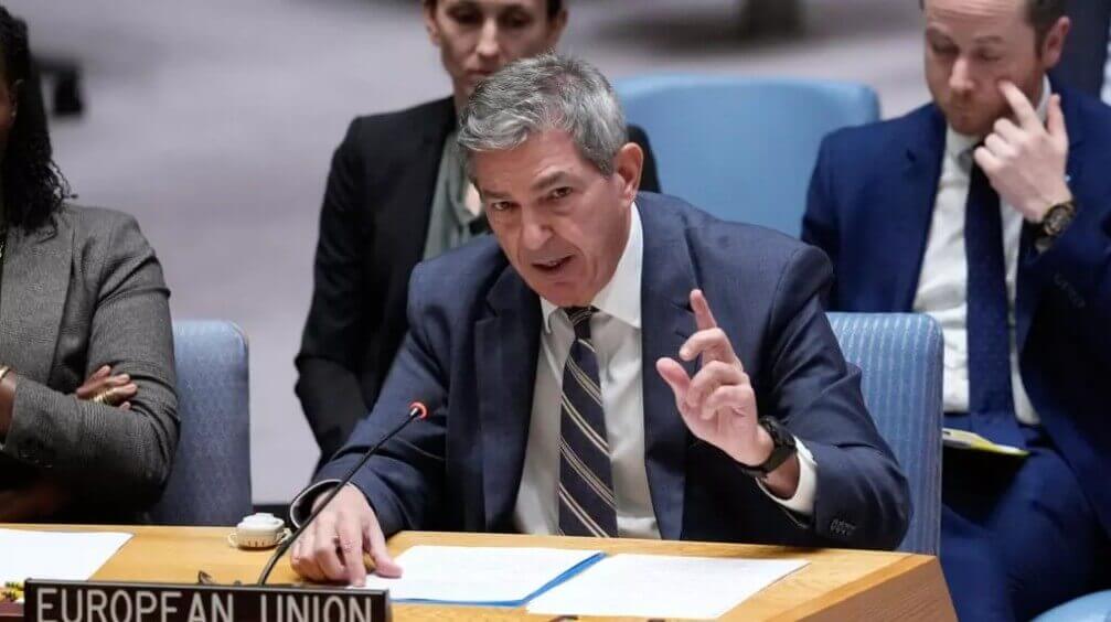 Stavros Lambrinidis, người đứng đầu phái đoàn Liên Hiệp Châu Âu tại Liên Hiệp Quốc, phát biểu trong cuộc họp của Hội đồng Bảo an về Ukraine tại trụ sở Liên Hiệp Quốc, New York, Mỹ, ngày 20/11/2025. AP - Seth Wenig