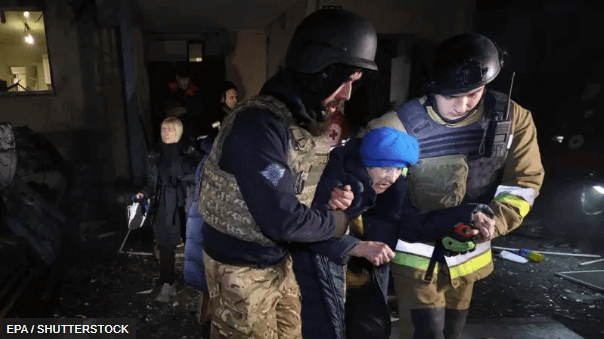 Nhân viên cứu hộ hỗ trợ một gia đình rời khỏi tòa nhà bị hư hại sau một cuộc không kích chết người của Nga vào khu dân cư ở thành phố Zaporizhzhia, miền đông nam Ukraine - EPA / Shutterstock