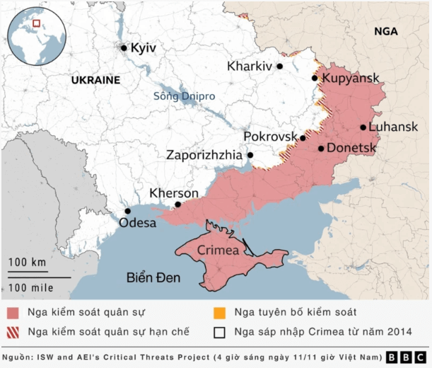 Hiện lực lượng Nga kiểm soát khoảng 1/5 lãnh thổ Ukraine và đang tiếp tục tiến quân, đồng thời liên tục tấn công hạ tầng cơ sở năng lượng của Ukraine khi mùa đông đến gần.