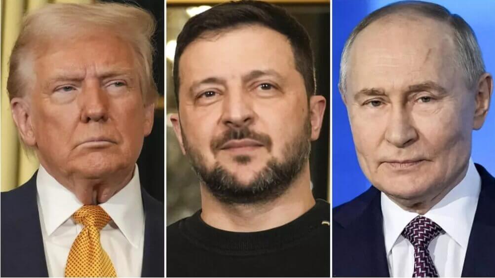 Ảnh ghép từ trái sang phải : Tổng thống Ukraine Volodymyr Zelensky, Mỹ Donald Trump, Nga Vladimir Putin.