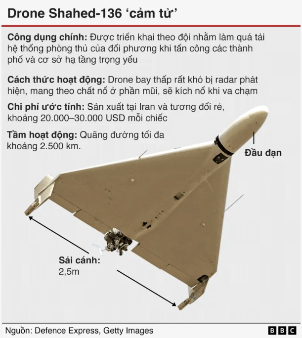 Trước đây, Nga nhập khẩu một loại gọi là Shahed-136 từ Iran, nhưng hiện nay họ sản xuất phiên bản riêng : Geran 2.