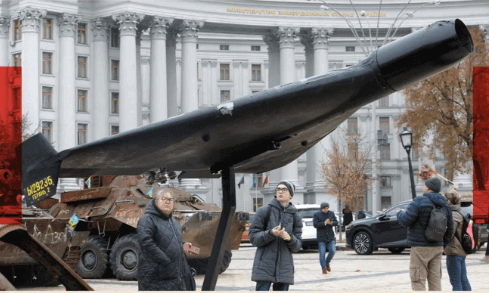 Người dân đang xem những mảnh vỡ của Geran-2, trong số các thiết bị quân sự bị phá hủy của Nga được trưng bày ở Kyiv