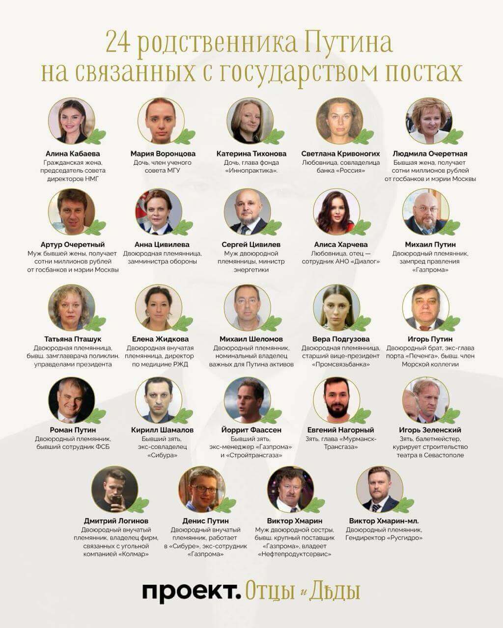 Theo báo cáo hôm 05/11 của cơ quan điều tra độc lập Proekt, tổng thống Nga Vladimir Putin đã đưa ít nhất 24 người thân vào các vị trí trong chính phủ hoặc trong các công ty nhà nước. Tờ The Moscow Time nhận định với con số kỷ lục này, ông Putin dường như đang tái hiện lại công cuộc tư hữu hoá quyền lực của các đời sa hoàng cuối cùng.