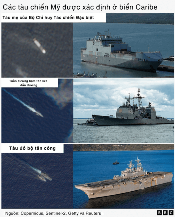 BBC Verify đã xác định một số tàu khác ở Biển Caribe - bao gồm một tàu khu trục tên lửa dẫn đường, một tàu vận tải đổ bộ, một tàu tuần dương tên lửa dẫn đường, và một tàu tấn công đổ bộ.