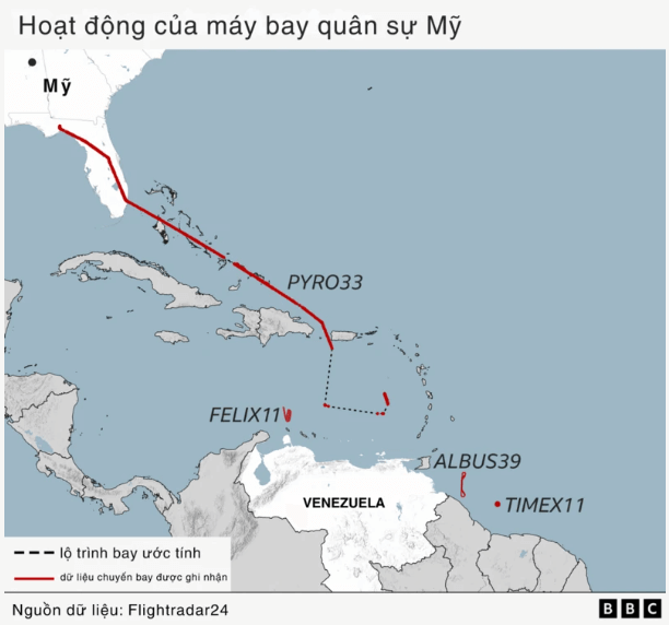 BBC Verify đã sử dụng dữ liệu theo dõi chuyến bay để xác định bốn máy bay quân sự Mỹ bay gần Venezuela vào ngày 20 và 21/11.