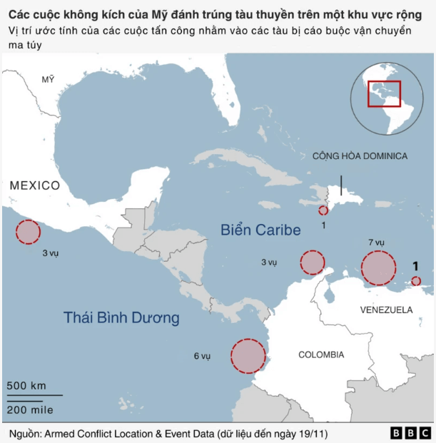 Từ ngày 2/9 đến ngày 19/11, lực lượng Mỹ đã tấn công ít nhất 22 tàu trong 21 cuộc tấn công riêng biệt ở vùng biển quốc tế, cả ở Caribe và phía đông Thái Bình Dương.