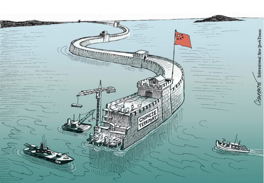 Để chống lại cảm giác bị giam cầm này, Đảng cộng sản Trung Quốc bê-tông hóa để gia cố các đảo nhỏ hiện đang có tranh chấp, xây dựng các sân bay và căn cứ hải quân, và sau đó thiết lập việc bảo vệ vùng lãnh hải liên quan. Hải quân và lực lượng hải cảnh của Trung Quốc, được trang bị các tàu được vũ trang tương đương như các tàu khu trục, sẽ truy lùng, xua đuổi các phương tiện mà họ cho là những kẻ xâm nhập. Nhiều chuyện phi lý đã xảy ra. Về phần mình, Hải quân Mỹ thường xuyên tiến hành các hoạt động tự do hàng hải, với các tàu vượt qua các đường ranh giới hiện đang có tranh chấp để chứng minh rằng Hoa Kỳ không công nhận chủ quyền mà Trung Quốc yêu sách.