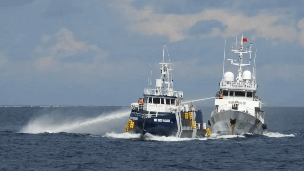 Một tàu của Lực lượng bảo vệ bờ biển Trung Quốc (phải) sử dụng vòi rồng tấn công tàu BRP Datu Pagbuaya của Philippines, gần đảo Thị Tứ, do Philippines chiếm đóng ở Biển Đông, ngày 12/10/2025. Ảnh do Lực lượng bảo vệ bờ biển Philippines cung cấp. AP