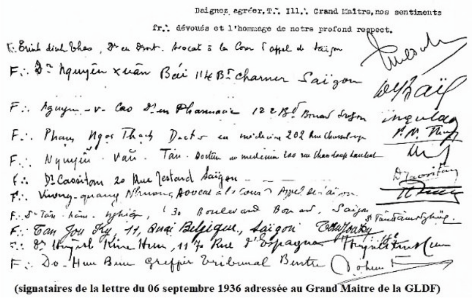 Thư viết ngày 6/9/1936 của những người Việt Nam trong Hội Tam Điểm gởi đến Đại Phụ Hội Tam Điểm Pháp