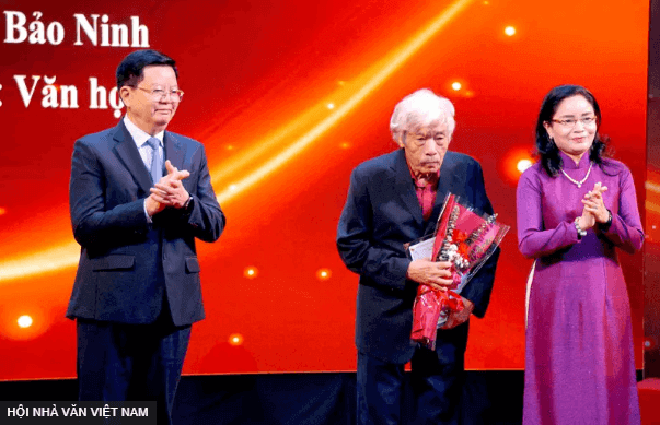Tại lễ vinh danh do Bộ Văn hóa, Thể thao và Du lịch tổ chức, nhà văn Bảo Ninh nhận hoa và bằng chứng nhận từ Phó Thủ tướng Mai Văn Chính và Thứ trưởng Bộ Văn hóa, Thể thao và Du lịch Trịnh Thị Thủy.