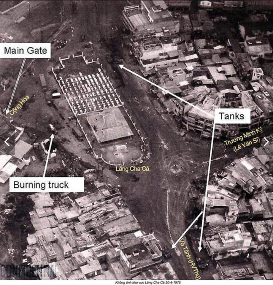Vị trí các xe tăng của Quân Giải phóng bị bắn cháy ngày 30/4/1975 - Không ảnh của Jacques Pavlovsky