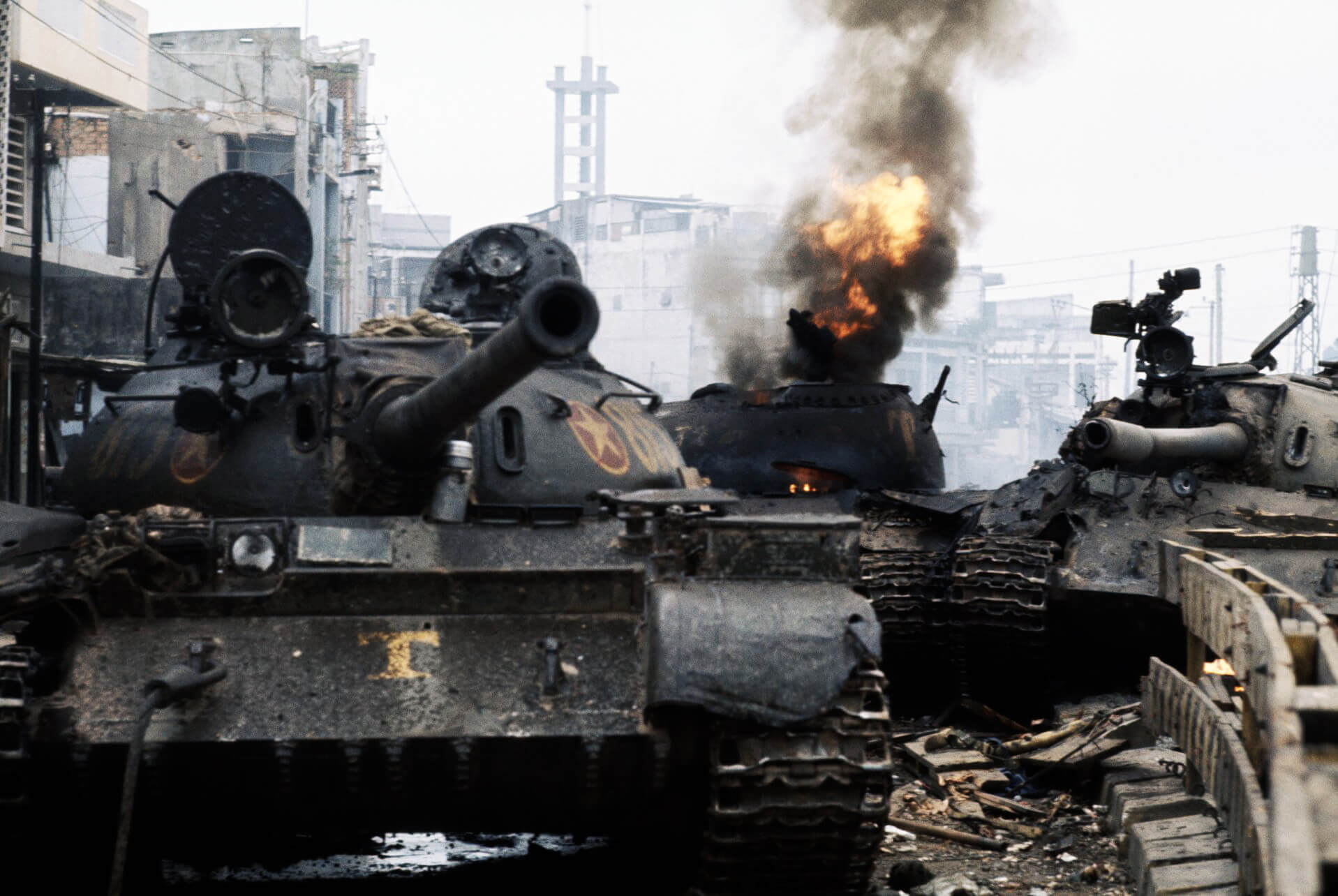 3 xe tăng Quân giải phóng bị bắn cháy ở khu vực tường rào Lăng Cha Cả. Phía sau là tháp chuông nhà thờ Mẫu Tâm - 389 Hoàng Văn Thụ, Tân Bình hiện nay - Ảnh Hãng tin Corbis