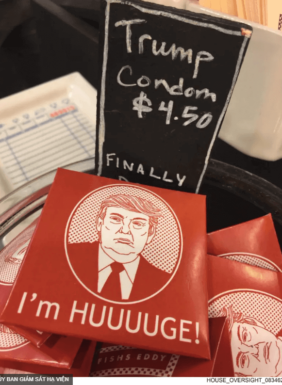 Một bức ảnh nữa cho thấy một hình minh họa giống tổng thống trên bao lì xì màu đỏ bên cạnh một tấm biển ghi : "Bao cao su Trump" (Trump Condom). Nguồn hình ảnh : Ủy ban Giám sát Hạ viện