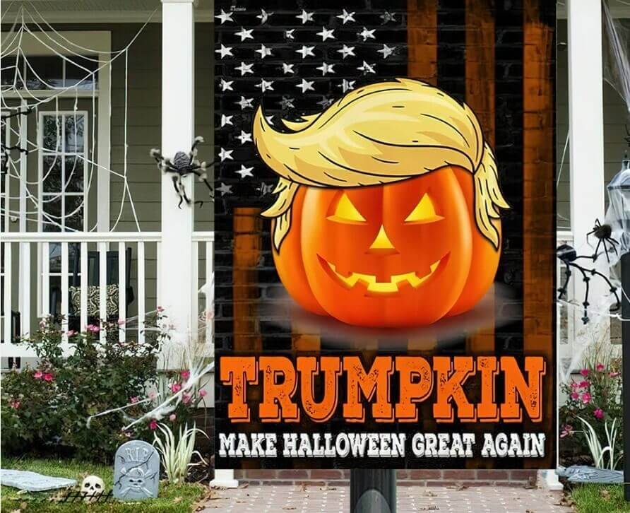 Có một hình ảnh về quả bí ngô màu cam với bộ tóc giả màu vàng đã được chạm khắc giống ông Trump. Phia trên có một tấm biển ghi : "Trumpkin. Make Halloween Great Again" (tạm dịch : Bí ngô Trump, làm Halloween vĩ đại trở lại).