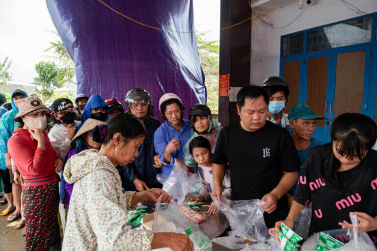 Người dân xếp hàng nhận hàng cứu trợ sau đợt lũ vào ngày 24/11/2025, tại thôn Phú Hữu, tỉnh Đắk Lắk. (Hình : Thanh Hue/Getty Images)