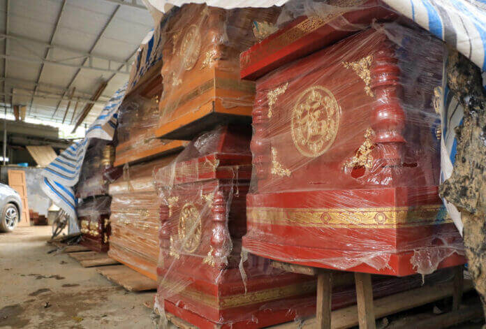 Những chiếc quan tài được mạnh thường quân mang tới hỗ trợ người dân xã Hòa Thịnh, tỉnh Đắk Lắk, bị thiệt mạng do lũ. (Hình : Cao An Biên/Thanh Niên)