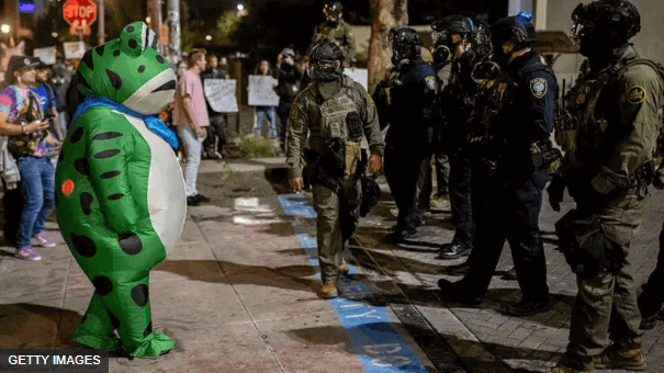 Hình ảnh các nhân viên nhập cư ở Portland phun hóa chất kiểm soát đám đông vào bộ trang phục ếch của một người biểu tình đã lan truyền rộng rãi trên mạng vào tháng 10