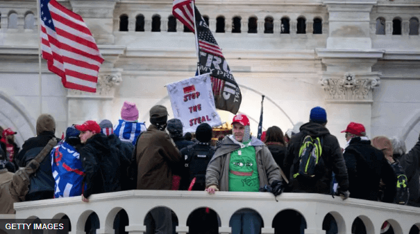 Một người đàn ông mặc áo in hình Pepe trong cuộc bạo loạn ngày 6/1/2021 tại Capitol Hill, nơi những người ủng hộ Trump cố gắng ngăn chặn việc ông Trump thất cử trước Joe Biden