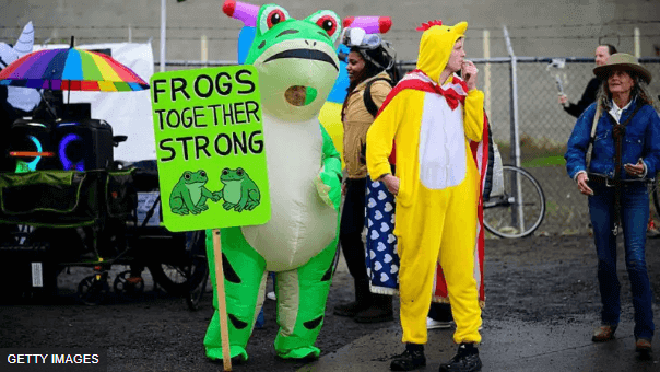 Nhưng điều đó đã thay đổi vào ngày 2/10, khi một cuộc đối đầu giữa một người biểu tình mặc trang phục ếch bơm hơi với khăn quàng cổ màu xanh lam và một nhân viên nhập cư ở Portland, Oregon, lan truyền rộng rãi trên mạng.