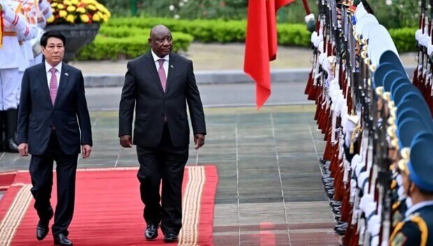 Chủ tịch nước Lương Cường và Tổng thống Nam Phi Cyril Ramaphosa duyệt đội danh dự tại Phủ Tổng thống ở Hà Nội, Việt Nam, ngày 23/10. Nhac Nguyen/AFP via Getty Images