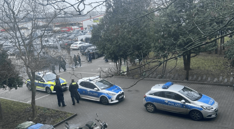 Các xe cảnh sát Đức túc trực trước cổng văn phòng làm việc của nhà báo Lê Trung Khoa để bảo vệ ông