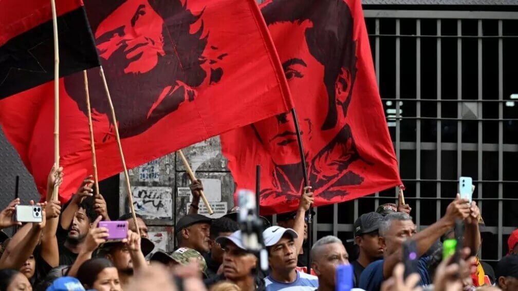 Người biểu mang cờ in hình Che Guevara và Simon Bolivar bên ngoài nhà Quốc hội tại Caracas trong ngày phó tổng thống Delcy Rodriguez nhậm chức tổng thống lâm thời Venezuela, ngày 05/01/2026. Reuters - Maxwell Briceno