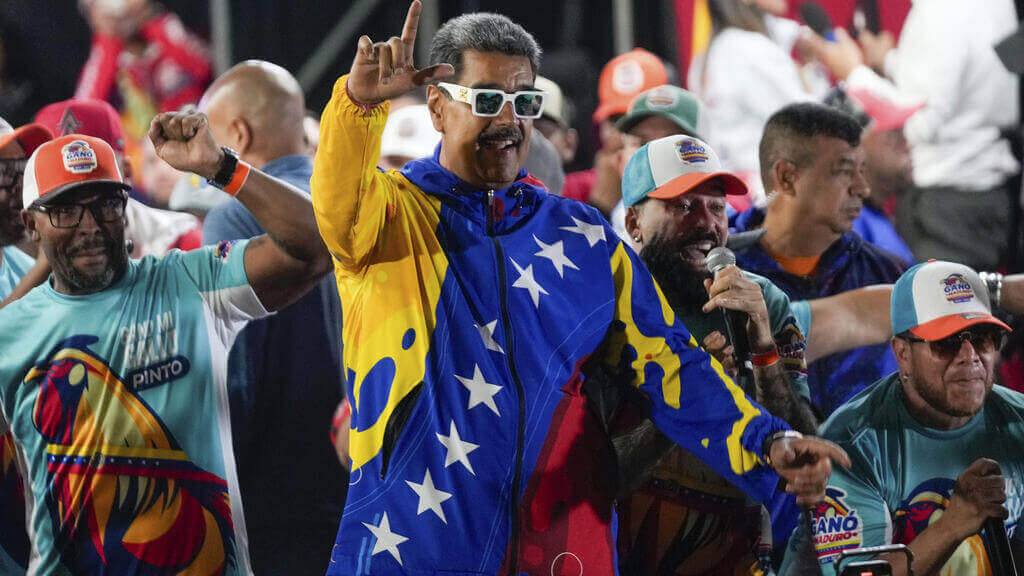 Tổng thống Nicolas Maduro nhảy múa bên ngoài phủ tổng thống Miraflores, Caracas, ngày 29/07/2024, mừng chiến thắng trong cuộc bỏ phiếu bị đối lập tố cáo gian lận. AP - Fernando Vergara