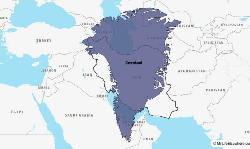 Iran có diện tích khoảng 1.648.195 km², trong khi Greenland có diện tích khoảng 2.166.086 km², lớn hơn Iran 31%. Trong khi đó, dân số Iran khoảng 86,8 triệu người, tức hơn 86,75 triệu người so với Greenland (56.500 người).