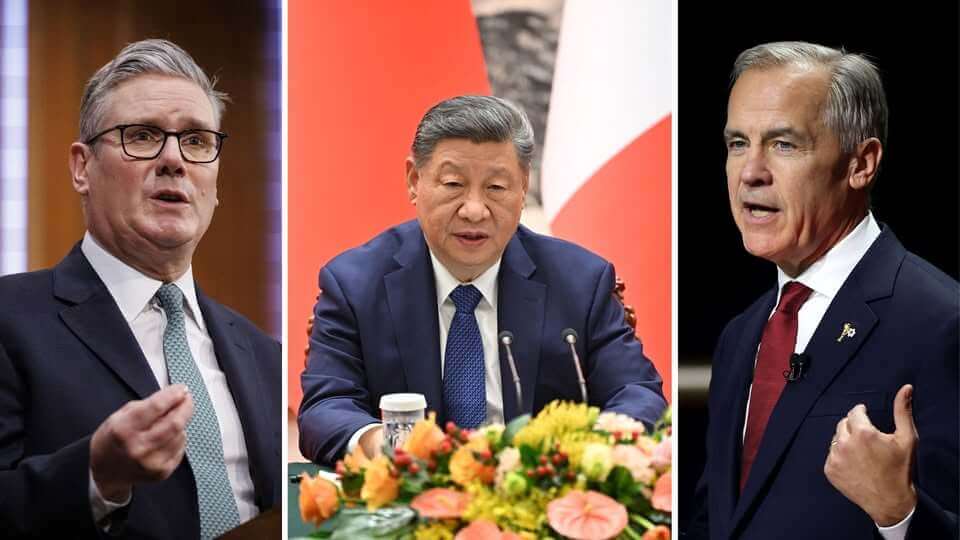 Ảnh ghép Thủ tướng Anh Keir Starmer, chính trị Trung Quốc Tập Cận Bình, Thủ tướng Canada Mark Carney