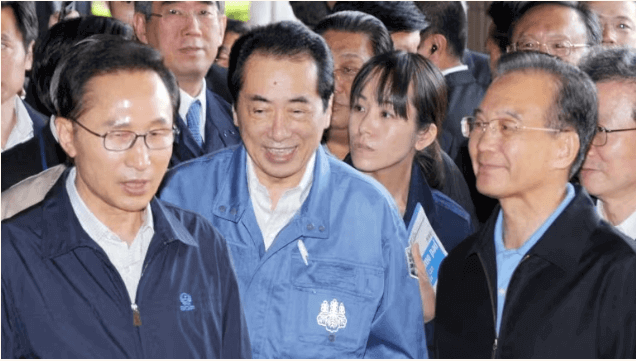 Thủ tướng Nhật Bản Naoto Kan (mặc áo xanh nhạt) bước vào một khu nhà trú ẩn cùng với Thủ tướng Trung Quốc Ôn Gia Bảo (phải) và Tổng thống Hàn Quốc Lee Myung-bak tại Fukushima, Nhật Bản, vào ngày 21/5/2011. Ôn sau đó đã tặng búp bê gấu trúc nhồi bông cho các trẻ em sống sót sau thảm họa kép tấn công Nhật Bản hai tháng trước đó.