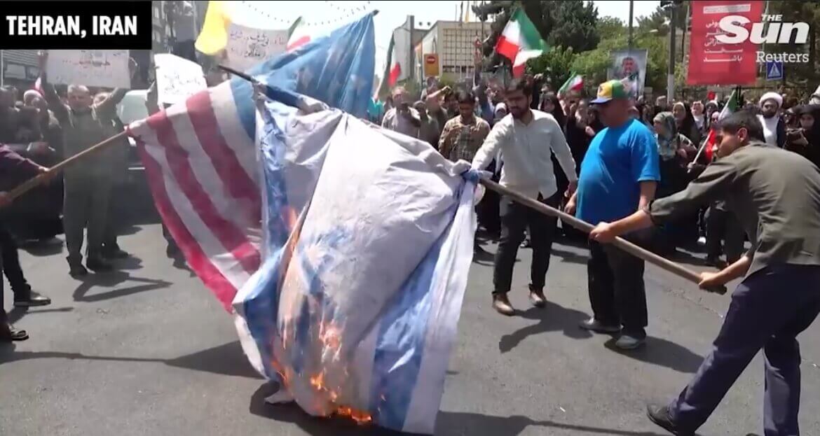 Cờ Mỹ và Iran bị đốt Tehran, ngày 20/06/2025, để phản đối các vụ tấn công của hai nước này nhắm vào Iran. AP - Vahid Salemi