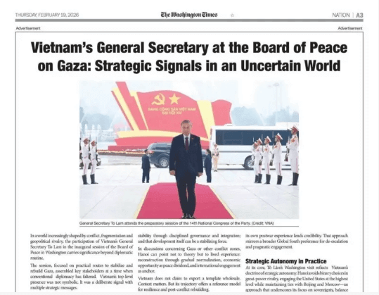 Một bài viết đăng trong mục Quảng cáo (Advertisement) trên báo Washington Times có nhan đề Tổng bí thư của Việt Nam tại Hội đồng Hòa bình về Gaza : Các tín hiệu chiến lược trong một thế giới bất định với hình chụp ông Tô Lâm nổi bật tại Đại hội 14, phía sau là đảng kỳ và quốc kỳ.