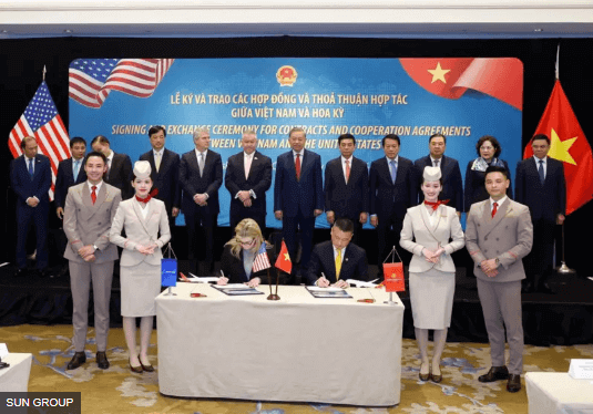 Tổng bí thư Tô Lâm chứng kiến lễ ký kết các thỏa thuận hợp tác ; trong ảnh là đại diện Sun PhuQuoc Airways và Boeing đang ký thỏa thuận mua bán máy bay
