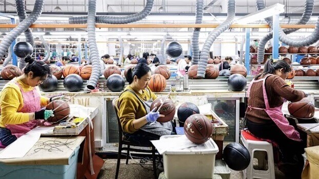 Công nhân sản xuất bóng rổ tại một nhà máy ở Sihong, Trung Quốc. Xuất khẩu bùng nổ và nhập khẩu yếu đã làm tăng thặng dư thương mại của Trung Quốc năm ngoái thêm 20% lên mức kỷ lục 1,2 nghìn tỷ đô la © AFP/Getty Images