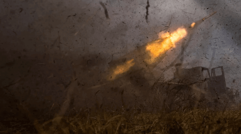 Một bệ phóng tên lửa MSLR BM-21 "Grad" của Lữ đoàn Không vận 95 Ukraine bắn về phía các vị trí của quân đội Nga trên tiền tuyến gần Kreminna, Ukraine, ngày 09/03/2023. AP - Evgeniy Maloletka